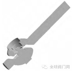 本文采用某型號(hào)調(diào)節(jié)閥,運(yùn)用三維建模軟件建立調(diào)節(jié)閥的實(shí)體模型,通過(guò)布爾運(yùn)算抽取調(diào)節(jié)閥及加長(zhǎng)管道部分。為了更好更準(zhǔn)確地模擬閥體內(nèi)部流動(dòng)情況,對(duì)閥出口管段進(jìn)行加長(zhǎng),加長(zhǎng)管道的長(zhǎng)度大約為250mm(約為管道直徑的5倍)。圖2所示為調(diào)節(jié)閥開度為10%時(shí)流道的剖面實(shí)體模型。