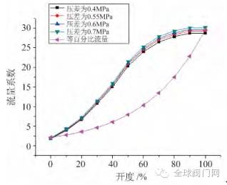 圖4 不同壓差下的流量系數(shù)與等百分比流量特性曲線對(duì)比