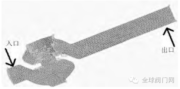 將調(diào)節(jié)閥流道的三維實(shí)體模型導(dǎo)入ANSYSWorkbench(網(wǎng)格劃分)軟件中進(jìn)行數(shù)值模擬計(jì)算的前處理。為了節(jié)省計(jì)算時(shí)間,建立流道模型的一半作為計(jì)算模型。為了提高計(jì)算精度和考慮數(shù)值計(jì)算對(duì)計(jì)算機(jī)的要求,在劃分網(wǎng)格時(shí)采用非結(jié)構(gòu)化的四面體網(wǎng)格。劃分后的網(wǎng)格數(shù)大約為5萬(wàn)左右。設(shè)置邊界條件為壓力入口和壓力出口,流道模型剖面設(shè)置為對(duì)稱面邊界。調(diào)節(jié)閥開度為10%的流道網(wǎng)格劃分如圖3所示。