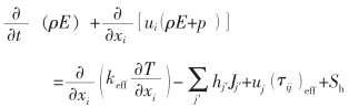 其中,keff=kt+k。方程右邊前三項(xiàng)為導(dǎo)熱項(xiàng)、組分?jǐn)U散項(xiàng)和黏性耗散項(xiàng)。