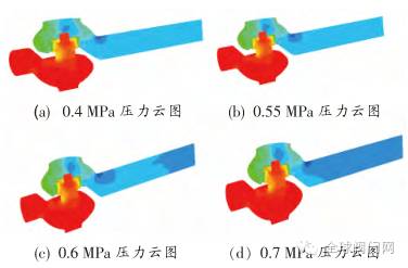 對(duì)開度為50%時(shí)調(diào)節(jié)閥在不同壓差下的流場(chǎng)進(jìn)行分析。選取不同壓差下的壓力云圖和壓差為0.4MPa、0.6MPa的速度等值線圖進(jìn)行分析。從圖5~圖7可以看出,壓力和速度變化**的地方出現(xiàn)在閥芯啟閉的部位。在閥門出口的拐角處也出現(xiàn)了明顯的壓力和速度值的變化,該處壓力和速度值的變化是由于產(chǎn)生渦漩造成的。在閥門的進(jìn)出口位置和閥腔內(nèi)流體流動(dòng)比較均勻,壓力和速度值保持恒定。流體的**流速還與閥的前后壓差成正比關(guān)系,隨調(diào)節(jié)閥前后壓差的增大而增大,并且調(diào)節(jié)閥的**速度出現(xiàn)在閥芯啟閉部位。由能量守恒可知,在閥門壓力大的地方流體的流速相對(duì)較小,流體流速**的部位流體壓力值*小。
